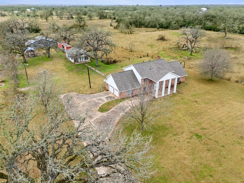 Discover endless possibilities with this stunning 22.5-acre unrestricted property in Hempstead, TX! This 2,994 sqft Colonial-style brick home is a true fixer-upper, but its well-designed floor plan is a must-see. A grand porte-cochère with towering columns and double doors welcomes you inside, where the spacious layout shines. The first-floor primary suite offers privacy, while the living room boasts a unique rounded fireplace and a wet bar. The kitchen, with an island and bay window overlooking the pasture, flows seamlessly into the formal dining room through elegant French doors. Upstairs, four spacious bedrooms feature walk-in closets and share two Jack & Jill baths. The utility/mudroom offers access to a half bath, the two-car garage, and an exterior door leading to a concrete path that connects to a 900 sqft guest house with two kitchens. The serene rural setting makes this a perfect investment or personal retreat. Call today to see it for yourself!