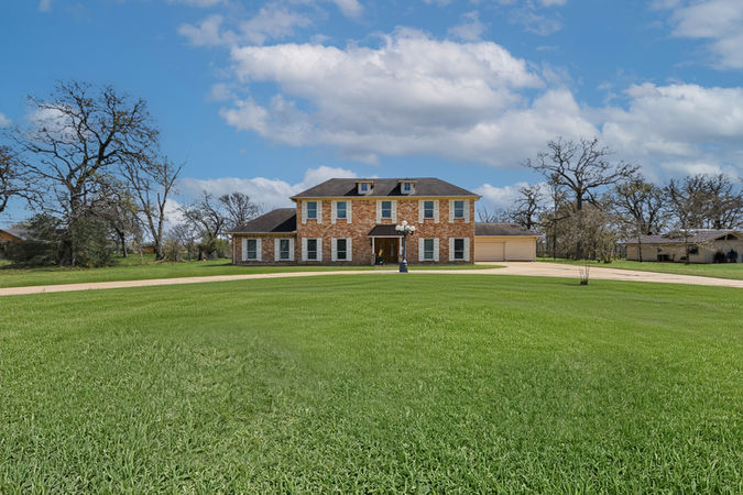 Enjoy country living on nearly 2 acres in a peaceful acreage community. This stately brick home features a spacious layout with breathtaking staircase entry way that leads into a large family room that includes a classic bar area with a wood burning fireplace. The first-floor primary suite offering dual vanities, clawfoot tub, and separate shower, plus an upstairs oversized bedroom or game room with en-suite bath and two additional bedrooms with shared bath; outside, relax on the generous patio overlooking a huge yard shaded by mature trees, with added highlights including a 2+ car garage with workshop, a separate steel building with roll-up door and concrete slab for RV/boat storage, and recent upgrades include updated bathrooms, PEX plumbing, fresh paint inside, all complemented by a beautiful long driveway that includes a circle drive.